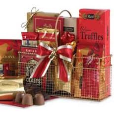 Product DescriptionChocolate, chocolate, and more rich, decadent chocolate! Our golden wire gift basket delights on any gift giving occasion, perfect for friends, family or clients. Make them fall in love all over again with a sampling of Godiva Milk Chocolate Strawberries, rich Belgian Chocolate Truffles, Blue Ridge Chocolate Bonbon Candy, premium Ghirardelli Dark Chocolate, Belgian Chocolate Petites, individually-wrapped Chocolate Stars, creamy Milk Chocolate Bar, Chuao's Picante Cocoa with Caramel, Chocolate Fudge, Chocolate Cocoa, and Extra Dark Chocolate Mignonettes. Each gift is carefully assembled in a pretty wire tote, tied with ribbon and includes a personalized gift card message from you to convey your heartfelt wishes.