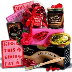 This pleasure packed Valentine s Day Gift Basket opens with a shaped container of rose bath petals. Just pluck off a few petals from a rose, toss them into your tub, and enjoy an aromatic, soothing soak, while munching on our delicious gourmet chocolate Lips. One of our most popular Valentine's Day Gifts, this design is guaranteed to raise your temperature as you indulge in your wildest chocolate fantasies.